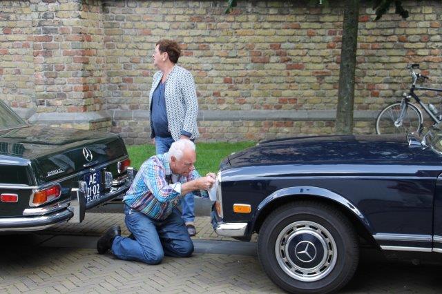 Bij binnenkomst in Franeker werden wij doorgelaten met het verzoek door te rijden tot de Grote kerk. Daar zouden wij worden opgevangen door iemand van de organisatie die ons een parkeerplek zou aanwijzen. Deze persoon was volkomen verrast dat wij kwamen. Hij had ons op zondag verwacht. Misverstand, want wij hadden toch duidelijk via de mail de AVC aangemeld voor zaterdag met opgave van NAW-gegevens en kentekenregistratie. De parkeerplaatsen voor de kerk moesten vrij gehouden worden voor de oldtimers met bouwjaren tot 1918 dus werd ons verzocht te parkeren in de straat naast de kerk. Probleem, want er was onvoldoende ruimte. Door de auto’s van de familie Postmus en Klijnstra voor de kerk te parkeren en een paar auto’s aan de overkant van de straat neer te zetten lukte het uiteindelijk toch voor alle auto’s van de AVC een plek te vinden. Al met al leverde het parkeergedoe toch wel enige irritatie op.